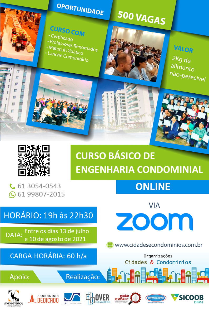 O Curso Básico de Engenharia Condominial, oferece 500 vagas dentro do conforto do seu lar, o curso será online, o curso busca fazer com que o participante obtenha a base de conhecimentos, para melhorar a atuação como síndico, podendo também ser síndico gestor de diversos prédios ou somente do seu próprio condomínio, gerenciando os edifícios, com conhecimento e habilidades de engenharia, arquitetura, aprovação de projetos, licenciamento, fiscalização dos conselhos, garantias, assembleias, quoruns, e as obrigações da legislação vigente